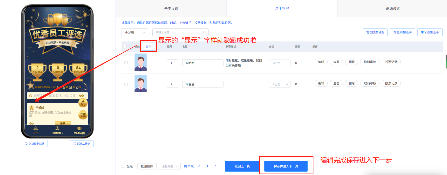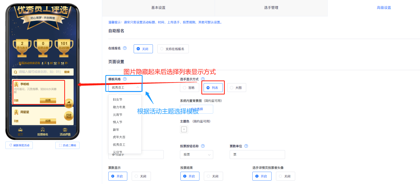 纯文字的投票活动可以把系统图片隐藏起来,显示的是“显示”字样就是已经隐藏啦;可以选择列表的排列方式,整体看起来会美观些;再根据活动主题选择模板风格等