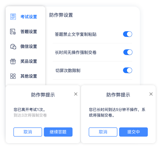 学科测评,职业考核等专题考试测评 防作弊功能助力完成严肃考试。