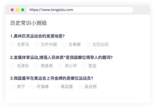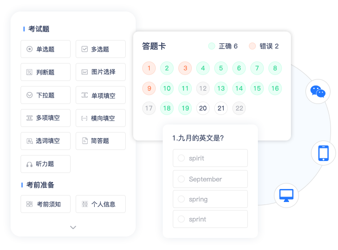 多题型种类,适合中小学线上考试、知识答题竞赛、技能考证测试,随堂测,支持微信小程序、H5、 电脑端答题。