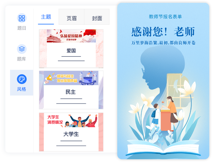 支持主题设置,页眉,封面和自定义图片更换, 提供各种节日庆典需求的封面。
